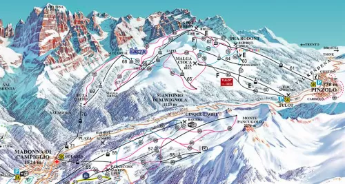 Belle piste nere aspettano lo sciatore più esigente: la pista Tulot, la DoloMitica Star e Tour, la Grual. Anche la rossa Rododendro avvince. Il demanio sciistico di Pinzolo è collegato, sci ai piedi, con Folgarida - Marilleva e Madonna di Campiglio; la skiarea Campiglio Val di Sole vanta 63 impianti di risalita e si sviluppa lungo 150 km di piste, 70.000 mq di snowpark, 40 km per lo sci nordico.