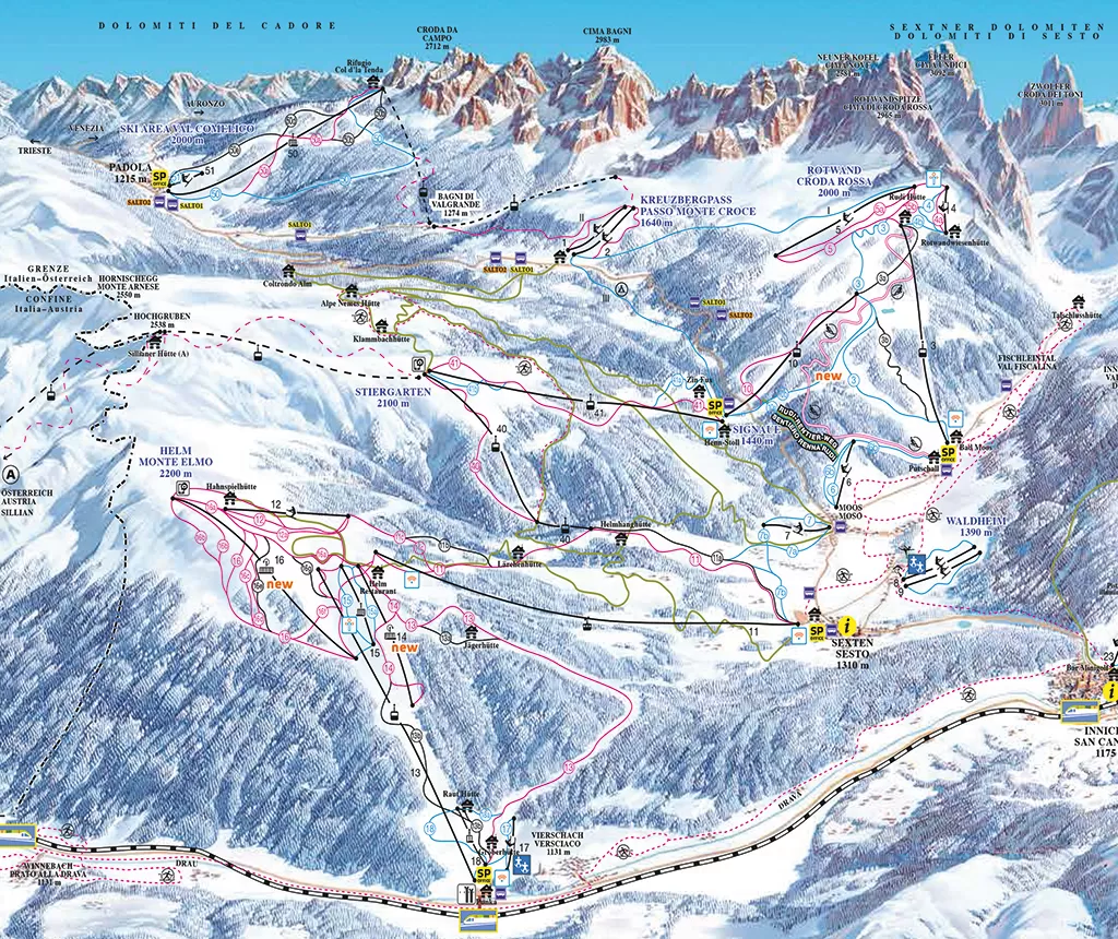 Un unico skipass è valido nelle aree sciistiche Monte Elmo - Sesto, Croda Rossa - Sesto - Moso, Comelico, Dobbiaco, Baranci - San Candido e le piccole Waldheim, Passo Monte Croce, Braies nel comprensorio Tre Cime