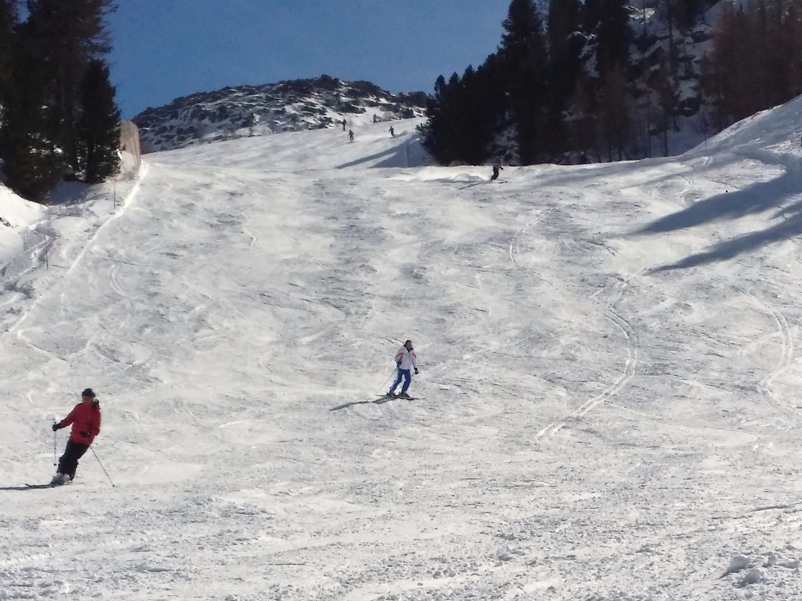 Neve perfetta,ma con alcuni mucchi causati sia dalla neve caduta 2 gg prima,sia dai tanti sciatori che affollavano le piste in una splendida giornata di sole.