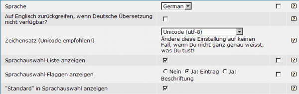 Mit diesen Einstellungen kannst Du die Sprach-/Übersetzungsoptionen von Coppermine beeinflussen. Lies unbedingt diesen Abschnitt sorgfältig durch, bevor Du Änderungen durchführst..