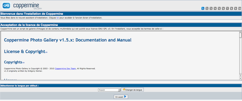 Depuis cpg1.5.x Coppermine utilise un assistant d'installation qui vous guide à travers la totalité du processus d'installation. Ci-dessous vous trouverez les étapes de l'assistant d'installation, avec un chapitre par étape.