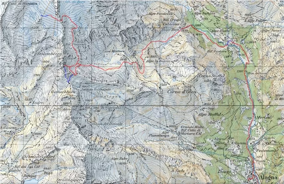 Tra l'Alpe di Bors ed il rifugio Pastore il rientro avviene su sentiero estivo, sinuoso e con possibili tratti ghiacciati può rendere faticose le ultime fasi di rientro. Superato il ponte coperto si risale il sentiero ridiscendendo poi fino a raggiungere la carrozzabile.