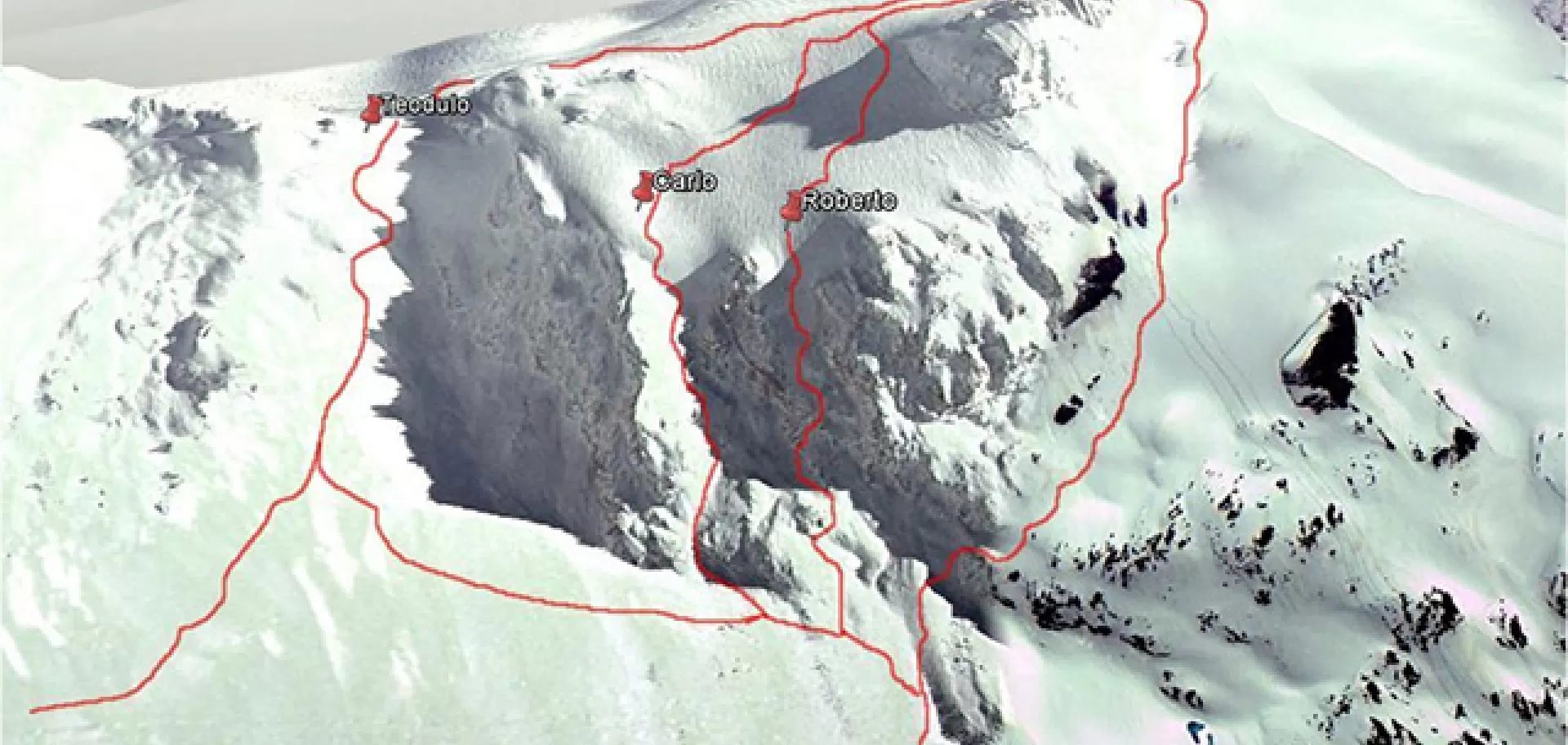 A partire dalle quote superiori tutti i percorsi fuoripista presentano passaggi su ghiacciaio. La presenza estesa di crepacci aumenta notevolmente il rischio di incidenti e la necessita’ di avere conoscenze specifiche di alta montagna diviene indispensabile.