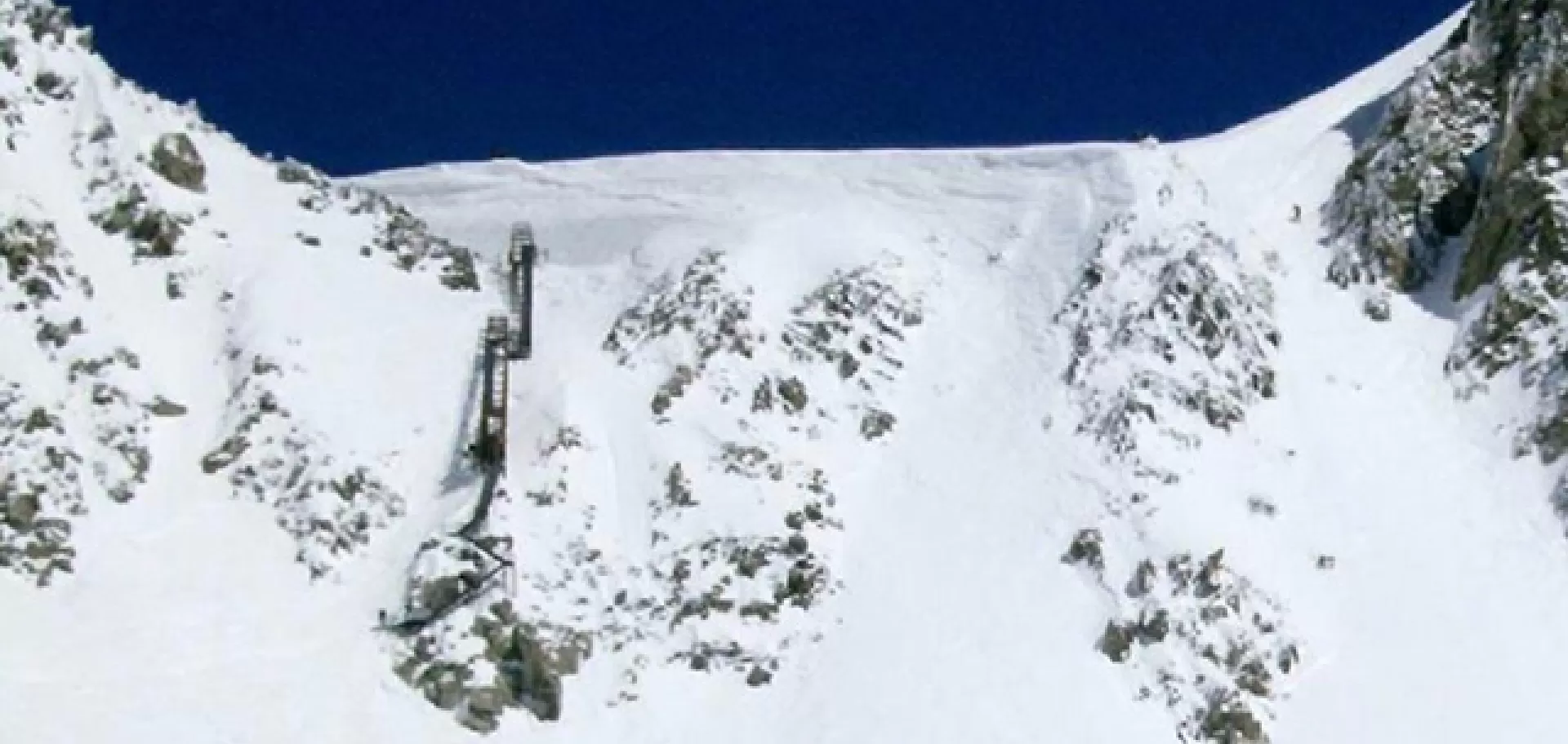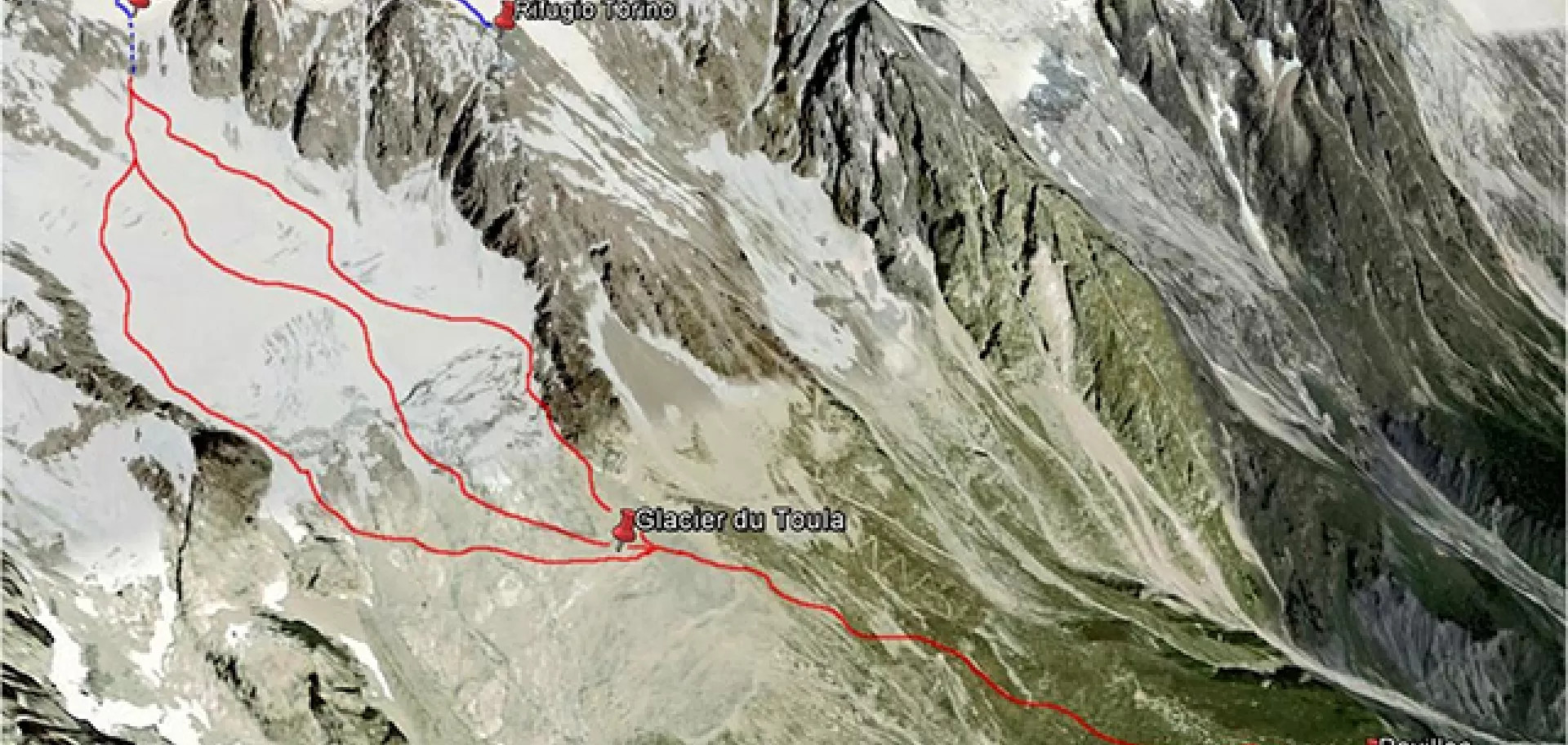 Dal colle posto sotto l'Aiguille du Toula si raggiunge la scala metallica che collega il ghiacciaio sottostante, in passato il passaggio si sviluppava verso sinistra mentre con l'introduzione della via battuta dai gatti ora l'ingresso avviene nel punto più a nord.