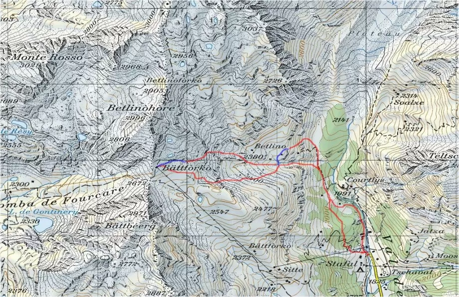 Raggiunto il colle della Bettaforca all'arrivo della seggiovia S.Anna (2670 mt) portarsi alla destra degli impianti dove sara' possibile risalire l'evidente collinetta per guadagnare qualche metro di dislivello o iniziare immediatamente la discesa seguendo la pista per un centinaio di metri e abbandonarla poi uscendo verso Est (a SX scendendo).