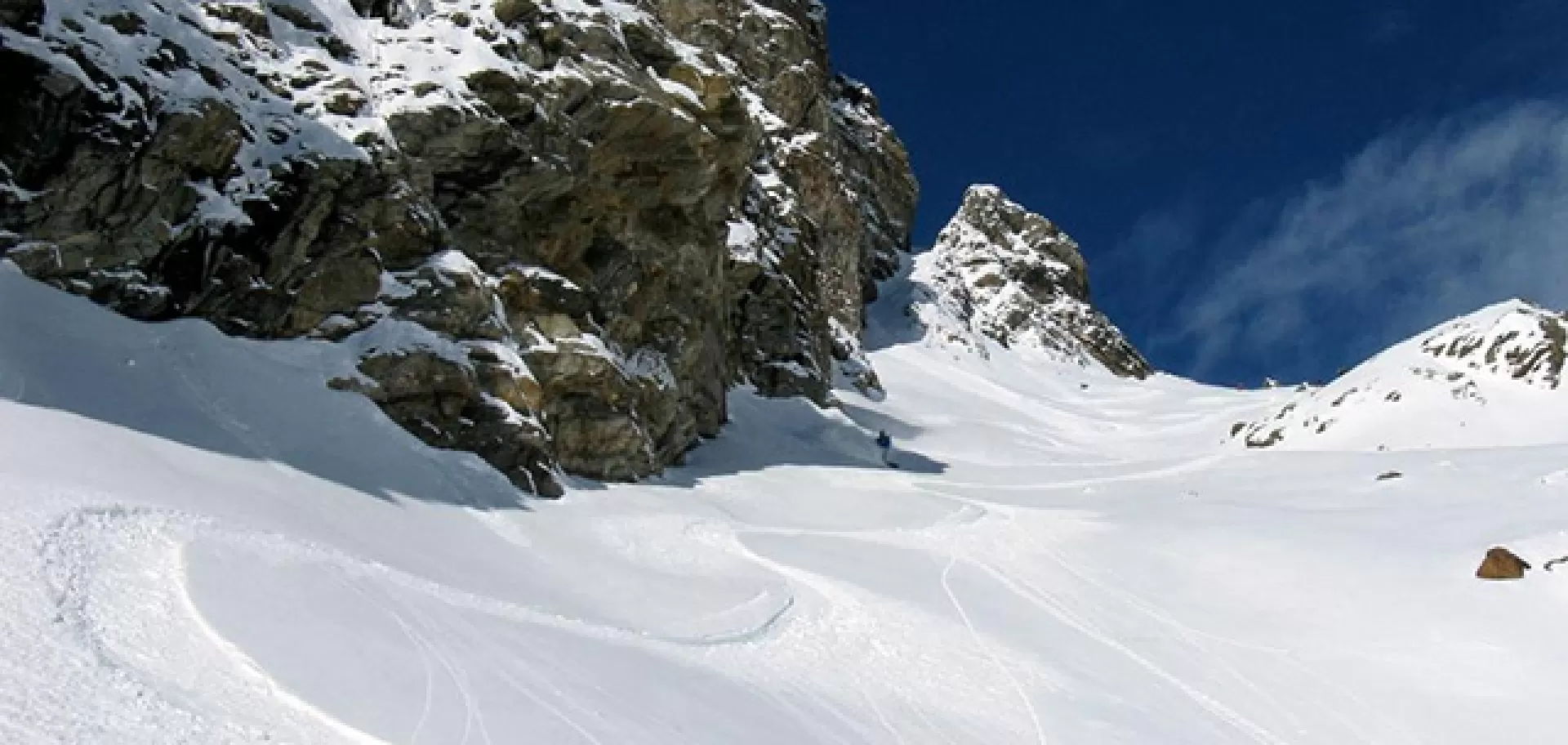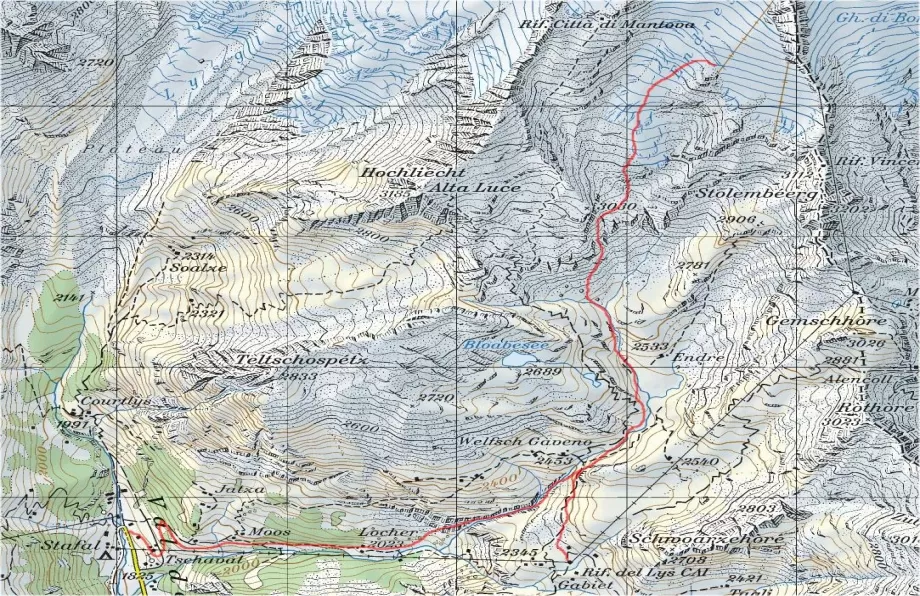 Giunti in vista dell'imbocco dell'evidente gola per il Canale dell'Aquila tenersi alti superando verso destra le roccette affioranti. Continuando a tenere la destra si imbocchera' l'ampio pendio che diverra' piu' ripido in prossimità della parte mediana. Il raccordo al percorso precedente avverra' nella piana sottostante accanto al nuovo 'Horestes Hutte'.