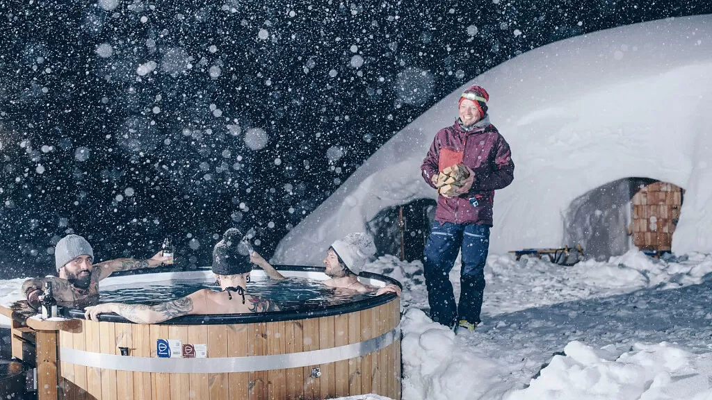 Il romantico pernottamento in igloo è un'esperienza magica per avventurosi amanti del benessere: tanta natura, vicini al cielo stellato, benessere nella sauna e nella vasca da bagno riscaldata, romanticismo nell'accogliente igloo e cibo eccellente. Contrariamente alle aspettative, la temperatura sotto la cupola di neve non scende sotto lo zero come quella esterna. Bastano quindi delle coperte morbide, delle candele e un sacco a pelo per godere di un’esperienza unica abbracciati alla persona che più si ama.