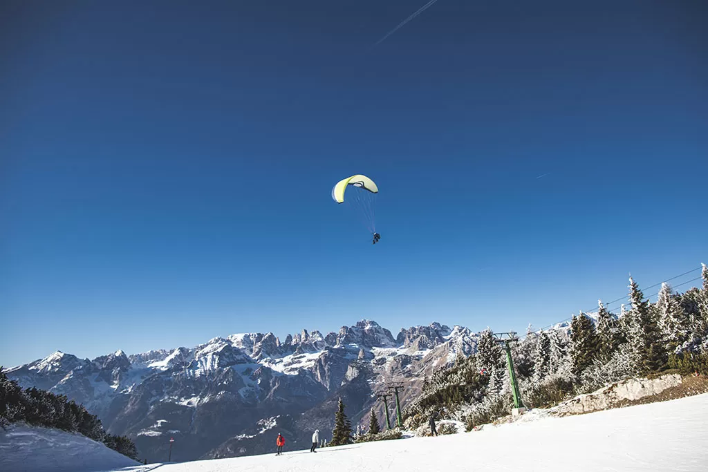 In Paganella è possibile volare con il parapendio in tandem, insieme a istruttori qualificati. Il decollo avviene dalla Cima Paganella a quota 2.125 metri per poi sorvolare i pendii innevati della Ski Area con lo sguardo su boschi secolari, sul lago di Molveno e sulle cime delle Dolomiti di Brenta. Il volo in parapendio termina con un morbido atterraggio a valle. L'istruttore che accompagnerà spiegherà passo passo tutte le fasi necessarie. Possibilità di decollare e atterrare anche con gli sci ai piedi.