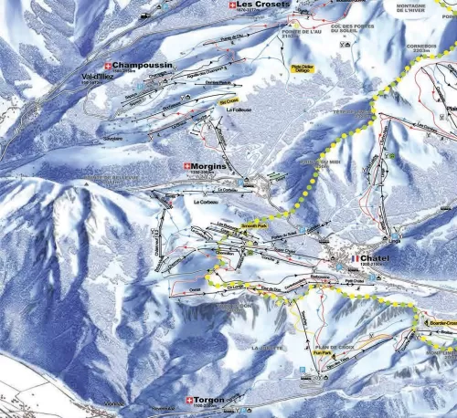 Le piste della skiarea di Morgins sono adatte in gran parte agli sciatori principianti e di livello medio: 41 piste di cui 21 blu, 17 rosse e 3 nere, 100 km di piste servite da 6 impianti. A Morgins e a Champoussin si può sciare anche in notturna una volta la settimana (vedi dettagli).