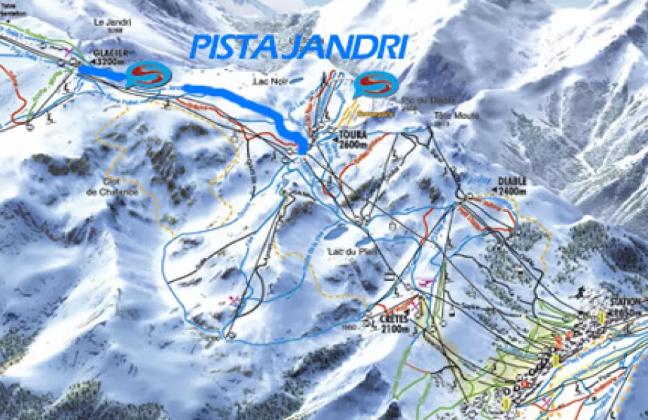 Posta tra i 3200 e i 2600 metri di quota nel comprensorio di Les Deux Alpes, offre un ottimo innevamento e splendidi panorami di alta quota. Le due S (foto sopra) rappresentano il tratto più impegnativo della pista. Va detto però che la variante più esterna è decisamente più facile. Il tracciato diventa poi meno pendente pur continuando nel suo percorso tortuoso (foto sotto) sino a Toura a 2600 metri di quota. La pista finisce qui, in corrispondenza della partenza della seconda tratta della telecabina Jandri Express e della seggiovia ad 8 posti che porta al ghiacciaio. E' però possibile scendere sino a valle anche con piste facili, ma occorre prestare attenzione a non imboccare le difficili piste Valentin o Sapins.