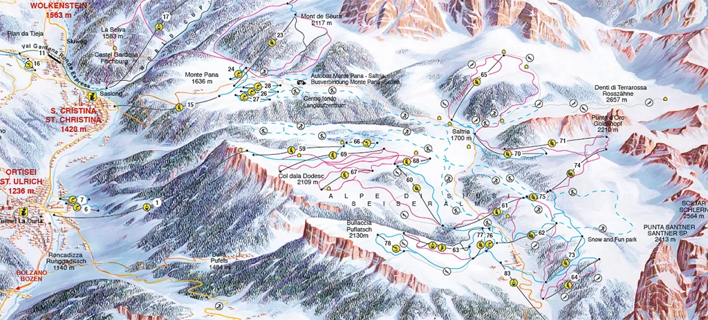 Gli impianti sono moderni e veloci e solcano bellissimi boschi. Alpe di Siusi, insieme alla Val Gardena, dà vita a un comprensorio sciistico con 175 km complessivi di piste costituendo così la più ampia area sciistica del carosello Dolomiti Superski. Nelle 2 scuole di sci e nella zona d'imbarco della seggiovia Laurin e Florian 8 tapis roulants aiutano i principianti sulla neve. Partendo da Saltria con il bus navetta si raggiunge il Monte Pana, da cui con gli sci ai piedi s'imbocca la Sellaronda con i suoi 40 km fra impianti e piste. Il King Laurin Snowpark offre adrenalina con jumps, kicks, boxes, walls.