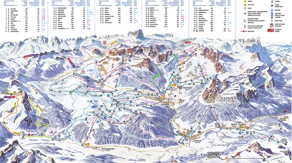 La skiarea offre facile accesso attraverso Colfosco e il Passo Gardena al circuito Sellaronda ed alle stazioni ad esso collegate: Arabba - Corvara - Colfosco - Malga Ciapela - Canazei - Val Gardena. Emozionante la pista Gran Risa (La Villa) dove si svolge la gara di Coppa del Mondo di slalom gigante o la discesa dal Piz Boè oppure la pista Armentarola che scende dal Lagazuoi con salita dal Passo Falzarego. Molto tranquilla la discesa dal Passo Gardena, ma di una eccezionale spettacolarità. L' Alta Badia fa parte del grande comprensorio del Dolomiti Superski, (450 impianti di risalita con oltre 1200 km di piste).