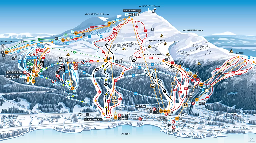 La stazione sciistica è suddivisa in tre diverse aree: Åre Björnen (molto adatto alle famiglie e ai bambini), la zona di Duved e la zona di Tegelfjäll. Sono tutti collegati tramite skibus. Il resort si trova vicino agli aeroporti di Östersund in Svezia e Trondheim in Norvegia.