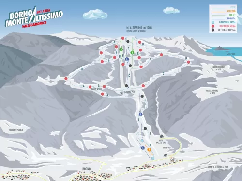 Borno è un grazioso borgo della Valle Camonica che offre un discreto numero di piste per lo sci alpino che si snodano tra i 1020 e i 1694 metri. Il parco impianti è composto da 3 seggiovie quadriposto, 1 skilift e 2 nastri trasportatori. Le piste, adatte a tutte le tipologie di sciatori, sono coperte al 90% da un impianto di innevamento programmato; scendono dal monte Altissimo, alcune in campo aperto, altre nei boschi di conifere. La pista nera "Direttissima" scende per 1600 metri da 1694 a 1292 metri.