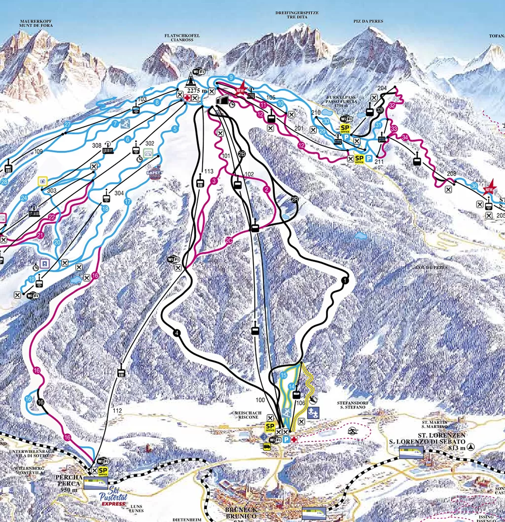 La skiarea di Plan de Corones comprende oltre Brunico, Valdaora, San Vigilio di Marebbe, San Martino in Badia collegate sci ai piedi.