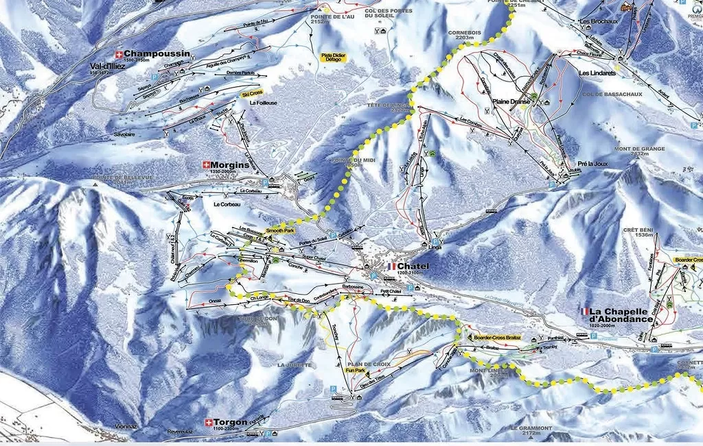 Les Portes du Soleil ha 12 stazioni collegate: 8 stazioni francesi, tra cui Avoriaz, Morzine, Montriond, Les Gets, St Jean d'Aulps Abondance, La Chapelle e Châtel e 4 località svizzere: Champéry, Torgon, Morgins, Crosets- Val d'Illiez-Champoussin. Offre 285 piste e 197 impianti di risalita.