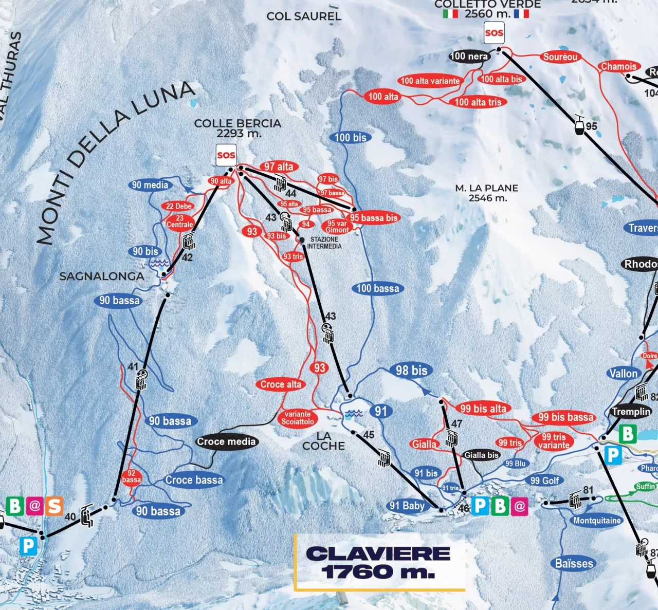 Le altre località della Vialattea sono:  SestriereSansicarioSauze d'OulxCesana TorinesePragelato e la francese Montgenèvre.
