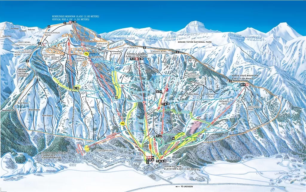 Ogni anno la valle è ricoperta da una coltre di neve che può raggiungere i 4-5 metri. Le precipitazioni intense favoriscono la formazione di grandi ghiacciai come lo Schoolroom, il Teton, lo Skillet. Il Rendezvous Mountain, il picco più alto e l'Apresvous sono due montagne che offrono emozioni per il grande sci. I grandi spazi (1000 ettari di terreno e 1200 ettari di terreno back country) ed i 1261 metri di dislivello sciabile compresi tra i 1924 e i 3185 metri con pendii a precipizio regalano emozioni.