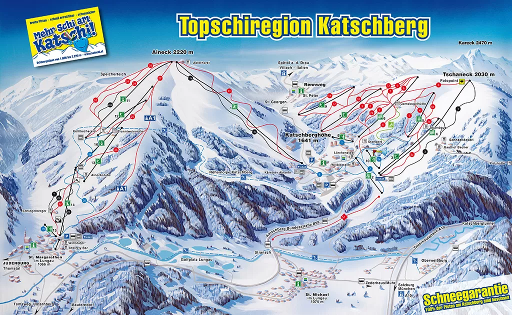 La skiarea della stazione sciistica austriaca di Katschberg si estende lungo i pendii del Monte Aineck (2200 metri) e del Monte Tschaneck (2300 m). Dal paese di St. Margarethen posto a 1066 m si sale con gli impianti sul versante dell'Aineck dove ci sono diverse piste interessanti per lo sci alpino, tra cui la nera "Direttissima" con una pendenza tra il 60 al 100%, o la A1, lunga 6 km che scende sino all'abitato (video).
