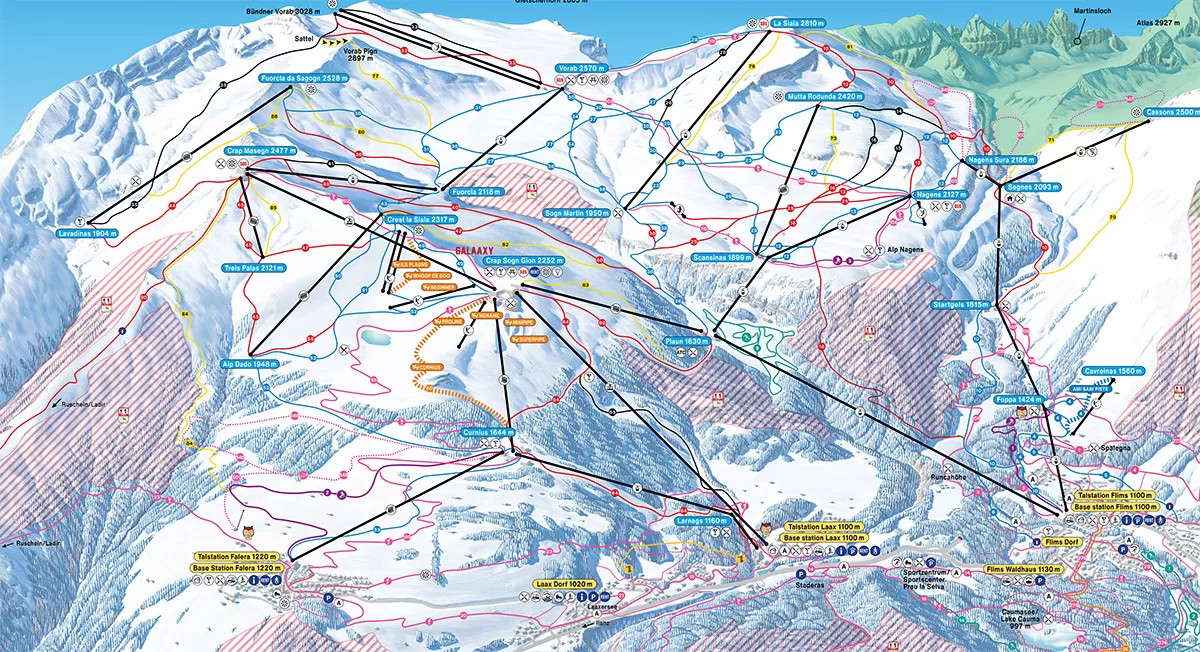 224 km di piste ottimamente preparati e due collegamenti sci ai piedi con Flims e Falera possono accontentare anche lo sciatore più esigente. Assolutamente imperdibili le piste 60 e la pista n. 65 che da Crap Sogn Gion a 2200 m scendono sino ai 1100 metri di Laax, percorribili anche nelle serate di martedì e giovedì. Il venerdì sera è invece dedicato allo slittino.