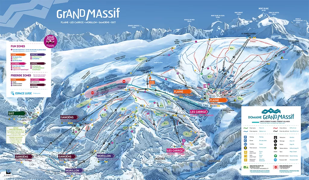 I 265 km di piste dell'area sciabile Le Grand Massif sono tutti collegati sci ai piedi e godono di precipitazioni nevose particolarmente abbondanti grazie alla posizione geografica. Le condizioni di innevamento delle piste sono generalmente perfette grazie all'esposizione a nord che caratterizza l'80% dei tracciati e al fatto che buona parte del comprensorio è disegnato tra i 1600 e i 2400 metri, anche se i punti di arroccamento di Morillon e Samoëns partono al di sotto dei 1000 metri.
