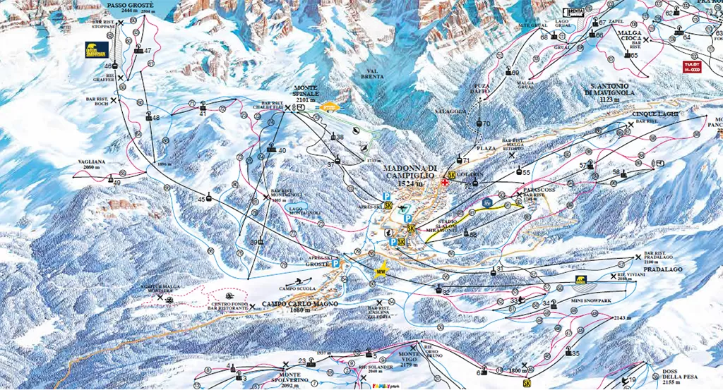 Madonna di Campiglio, è adagiata a 1550 metri di quota nella bellissima conca tra il gruppo delle Dolomiti di Brenta ed i ghiacciai dell'Adamello e della Presanella. La varietà del suo ambiente montano assicura d'inverno la possibilità di percorrere, partendo dal centro del paese e ritornandovi senza per questo togliere gli sci, innumerevoli chilometri di piste fino a 2600 metri, sempre diverse per grado di difficoltà. Storica la pista 3-Tre di Campiglio dove si svolgevano tutti i tipi di gare dello sci alpino (slalom, discesa libera e gigante) e oggi sede delle gare di slalom - slalom speciale. A chi ama le piste lunghe, panoramiche e poco pendenti consigliamo la pista Graffer, mentre ai più esperti consigliamo la Spinale Direttissima che scende dall'omonimo monte sino in paese. Il mitico Canalone Miramonti, teatro di gare di Coppa del Mondo, è a disposizione per coloro che vogliono sciare in notturna
