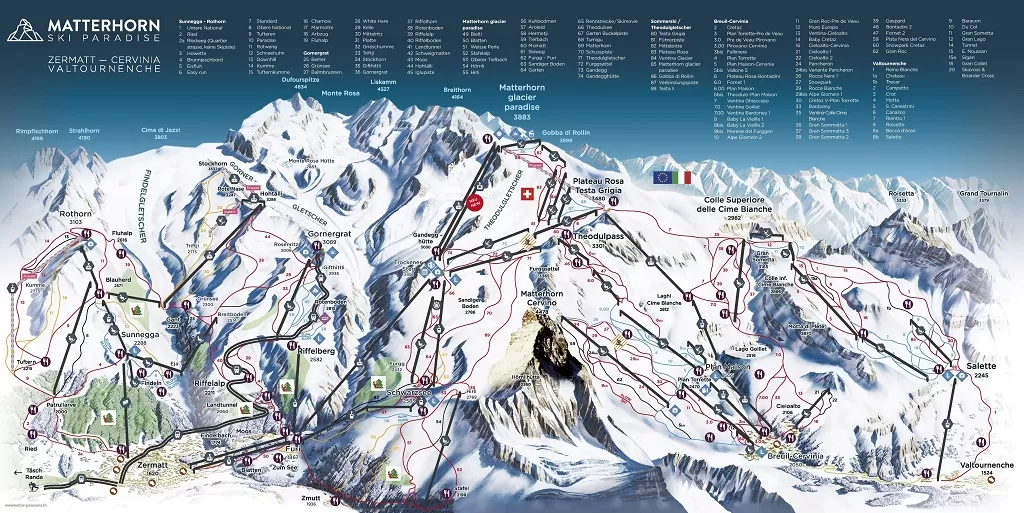 Il vasto comprensorio Matterhorn Ski Paradise, si estende a cavallo tra l'Italia (Breuil - Cervinia, Valtournenche) e la Svizzera (Zermatt). Un vero paradiso che si stende dal Rothorn (3103 m), al Gornergrat (3089 m), fino al Matterhorn Glacier Paradise (3883 m); da qui parte il collegamento con Breuil Cervinia - Valtournenche, attraverso la zona sud del Cervino, il Theodulpass - Plain Maison e le Cime Bianche.