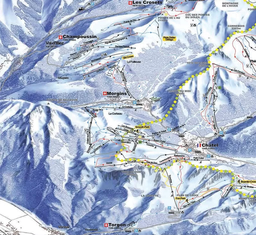Le piste della skiarea di Morgins sono adatte in gran parte agli sciatori principianti e di livello medio: 41 piste di cui 21 blu, 17 rosse e 3 nere, 100 km di piste servite da 6 impianti. A Morgins e a Champoussin si può sciare anche in notturna una volta la settimana (vedi dettagli).