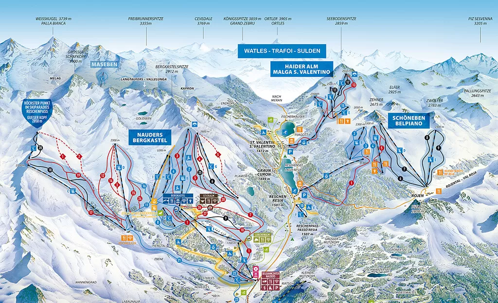Il comprensorio sciistico di Nauders si stende ad una altitudine compresa tra i 1.400 e i 2.850 metri sul Bergkastelspitze e dispone di 75 km di piste per lo sci alpino sempre perfettamente innevate grazie all'altitudine e al sistema d'innevamento artificiale che copre l'80%. Con i suoi 13 impianti di risalita e i molti percorsi, con diverso grado di difficoltà, è l’ideale per sciatori grandi e piccoli. I bimbi hanno a disposizione e piste facili dove imparare a sciare, un asilo alla stazione a monte Bergkastl (2200 m), una scuola di sci per bambini e un parco giochi con tenda degli indiani, palcoscenico, pista tubing, mini paese Nauderix.