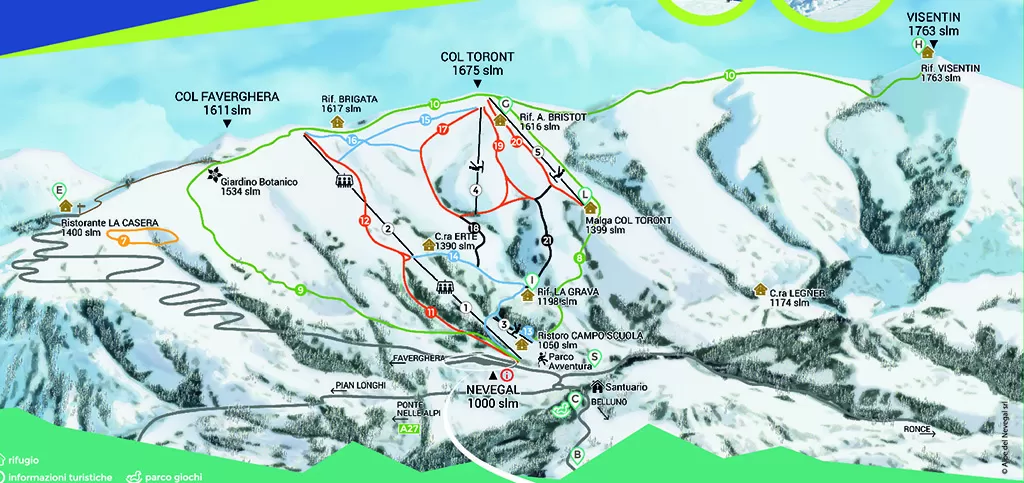 Si scia su 11 piste per lo sci alpino di ogni livello di difficoltà, tra cui 2 belle nere la Grava e l'Erte Basse. La pista rossa Coca è la più frequentata e scende dai 1600 metri d'altitudine vicino al Rifugio Brigata sino ai 1000 del paese. La parte finale della pista Coca, Coca Bassa, è dotata di illuminazione per lo sci in notturna ogni venerdì. Le piste in quota scendono dal Col Toront e dal Col Faverghera sino a valle. 6 gli impianti di risalita: 2 seggiovie triposto collegate sulla pista Coca, 3 skilift e 1 tapis roulant nel campo scuola.