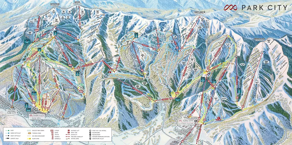 Park City comprende 3 stazioni sciistiche distanti tra loro circa 8 km e collegati da un sistema gratuito di trasporti pubblici. The Canyons Resort è il più esteso con 1500 ettari compresi tra i 2073 e 3045 metri. Il Deer Valley Resort è il più sofisticato per i servizi di elite. Per esempio il personale si prende cura degli sciatori per tutto il soggiorno ed anche dei loro sci. In quest'area come ad Alta (Utah) e a Mad River (Vermont) non è permesso praticare snowboard. Nel suo demanio sciabile la Montagna di Flagstaff ( 2773 m), Bald Mountain ( 2865 m), l'Empire ( 2917 m) con la discesa di Daly e Lady Morgan ( 2743 m) offrono ampie aree per gli sciatori avanzati. Bald Eagle Montain ( 2560 m) e Little Baldy Peak ( 2423 m ) sono montagne più adatte ai principianti ed agli intermedi. Ultima stazione sciistica, ma non meno importante delle altre due, è Park City Mountain Resort . Nella cittadina la Main Street mostra edifici storici che ricordano il periodo dell'attività mineraria, modernissimi negozi per lo shopping e locali per una vivace vita notturna. Una seggiovia parte dalla storica Main Street e trasporta sulle piste.