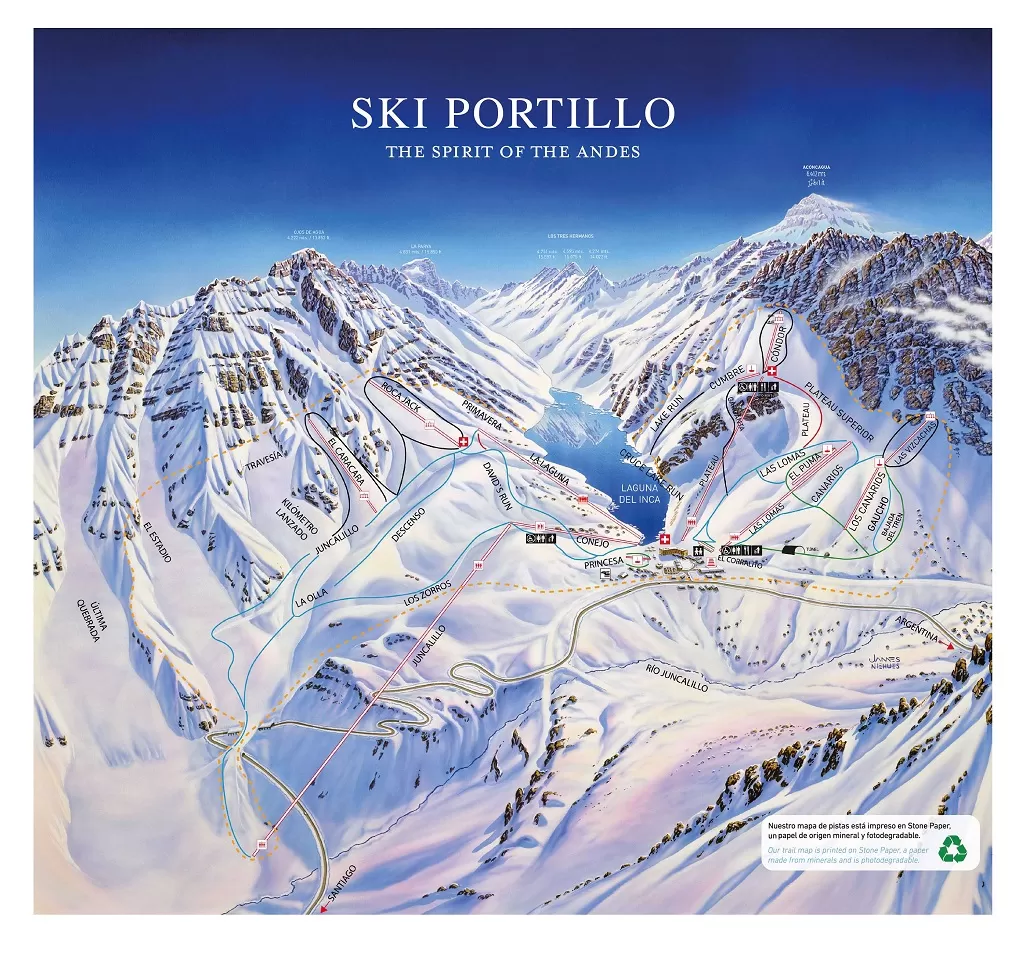 Il demanio sciistico è ampio, su 812 m di dislivello e dà la possibilità di salire sugli impianti senza code o di divertirsi nei fuoripista. La pista più lunga, rossa, è la Juncalillo Portillo, mentre la nera Kilometro Lanzado è famosa per i record di velocità raggiunti sui suoi pendii.