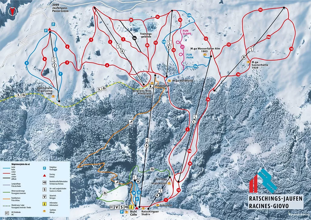 Racines - Passo Giovo, a 10 kilometri da Vipiteno, è una skiarea moderna e curata, con 25 kilometri di piste completamente coperti da innevamento programmato e un parco impianti all'avanguardia che comprende una cabinovia a 8 posti e diverse seggiovie di ultima generazione. Le piste di sci alpino sono particolarmente adatte agli sciatori di livello medio-avanzato. La Discesa Blosegg, di 2,5 kilometri, è il tracciato più lungo della stazione. Il Funpark Racines è adiacente alla seggiovia “Enzian”, offre una “wave line” per principianti, una “jib line” e una “kicker line” per i più audaci.