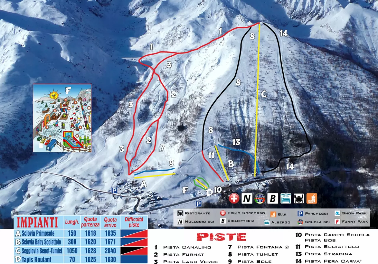 L'area sciistica è dotata di 4 impianti che salgono al Pian Benot e servono per lo sci alpino 3 piste blu ed una rossa-nera. Quest'ultima è lunga 1050 metri e scende da 2040 metri a 1618 metri con una bella vista sulle cime circostanti che si elevano oltre i 3500 m: il Monte Lera, il Croce Rossa a nord, la Punta Lunella a sud, il Rocciamelone a sud-ovest. Tutte le piste sono dotate di innevamento artificiale.