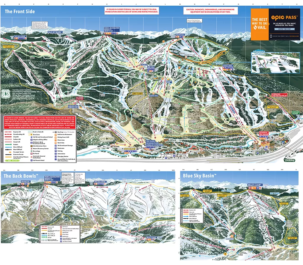 A Vail troviamo 34 impianti di risalita che servono 277 piste per una zona sciabile complessiva di 5289 acri divisi in tre distinte aree: il FrontSide a nord, di oltre 1600 ettari, con il Golden Peak adatta ai principianti e un lungo muro per gli intermedi; il Blue Ski, più adatto agli sciatori esperti e intermedi e agli snowboarders. Più difficile l'area Northwoods. L'ultima zona è quella a sud, sul fronte posteriore, con gobbe per esperti.