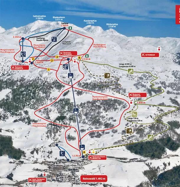 Da segnalare il tracciato Pichlberg-Plankenhorn, che dal "Sattele" a 2460 m scende fino alla stazione a valle, a 1570 metri: 3,7 kilometri con un dislivello di 900 m. Sulla pista Plankenhorn, servito dalla cabinovia San Martino si trova il Sunpark Reinswald, composto da 2 linee, Medium e Easy. Una pista nera tecnica e panoramica è la "Jochpiste", che dal "Sattele"  a 2470 m, arriva al "Pfnatsch-Alm" per 1.5 km di lunghezza e  400 metri di dislivello; per un tratto la pista ha addirittura una pendenza del 58%, ospita le gare di Coppa Europa.