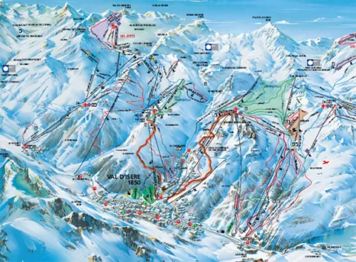 Davvero molto belle sono le piste, servite da modernissimi impianti tra cui ricordiamo la 3S Olimpique, telecabina famosa per le tre funi portanti e la seggiovia ad 8 posti Tommeuses. L'area sciistica si compone di tre zone principali tutte collegate tra loro: partendo da est troviamo il Vallon dell' Iseran, poi Solaise e la zona del Rocherde Bellevarde dove si svolgono le gare di discesa libera. Sono da segnalare la pista nera Epaule du Charvet e l'ex olimpico Volto, piste molto ripide.