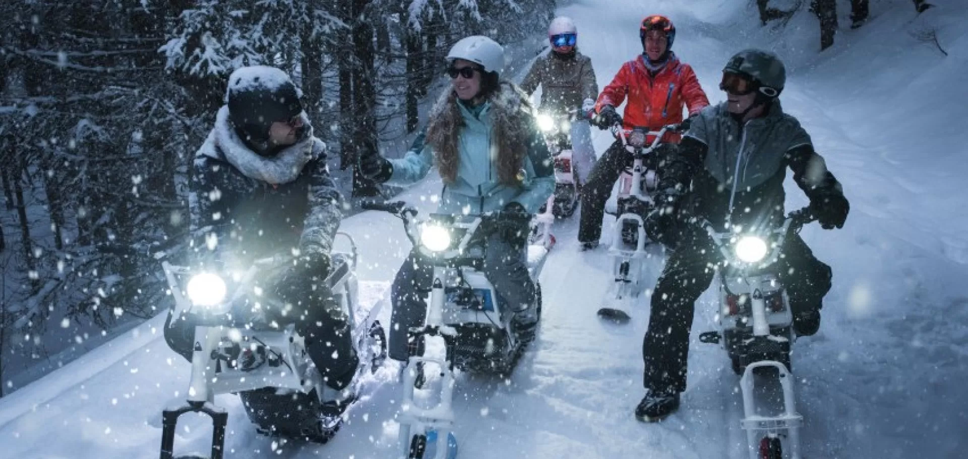 In primo luogo, ha fatto scalpore la "bici elettrica per la neve" di Moonbikes, startup francese specializzata nella mobilità sulla neve che sta producendo questo mezzo che può garantire spostamenti veloci, efficaci, silenziosi e non inquinanti sul manto bianco. Più che una bici elettrica, forse è una piccolissima motoslitta pur avendo il vantaggio di avere misure decisamente inferiori a quelli di una vera: pesa 74 kg + 13 kg di batteria ed è lunga poco più di 2 metri. Il telaio ricorda ovviamente una di quelle snowbike che di tanto in tanto vediamo in montagna, con un monosci anteriore ma con un cingolato dietro, mosso da un motore elettrico e dalla relativa batteria. In Europa, la Moonbike è già stata adottata da varie stazioni francesi tra cui Courchevel e Val d'Isère. Raggiunge una velocità massima di 42 km/h su un percorso pianeggiante, ha una autonomia che va tra i 90 minuti e le 3 ore e una portata di 120 kg. Sale pendenze fino al 40% ed è adatta ad essere guidata anche in 30 cm di neve fresca.
