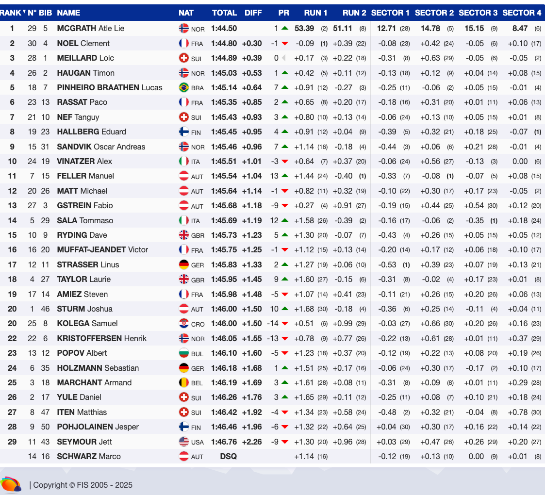 Ancora Norvegia ai piedi del podio con Timon Haugan, quindi il norvegese che corre per il Brasile Lucas Pinheiro Braathen, Rassat, Nef, Halberg, un altro norvegese, Sandvik, quindi Alex Vinatzer che completa la top 10 dopo una buona prima manche e una seconda con qualche errore di troppo.