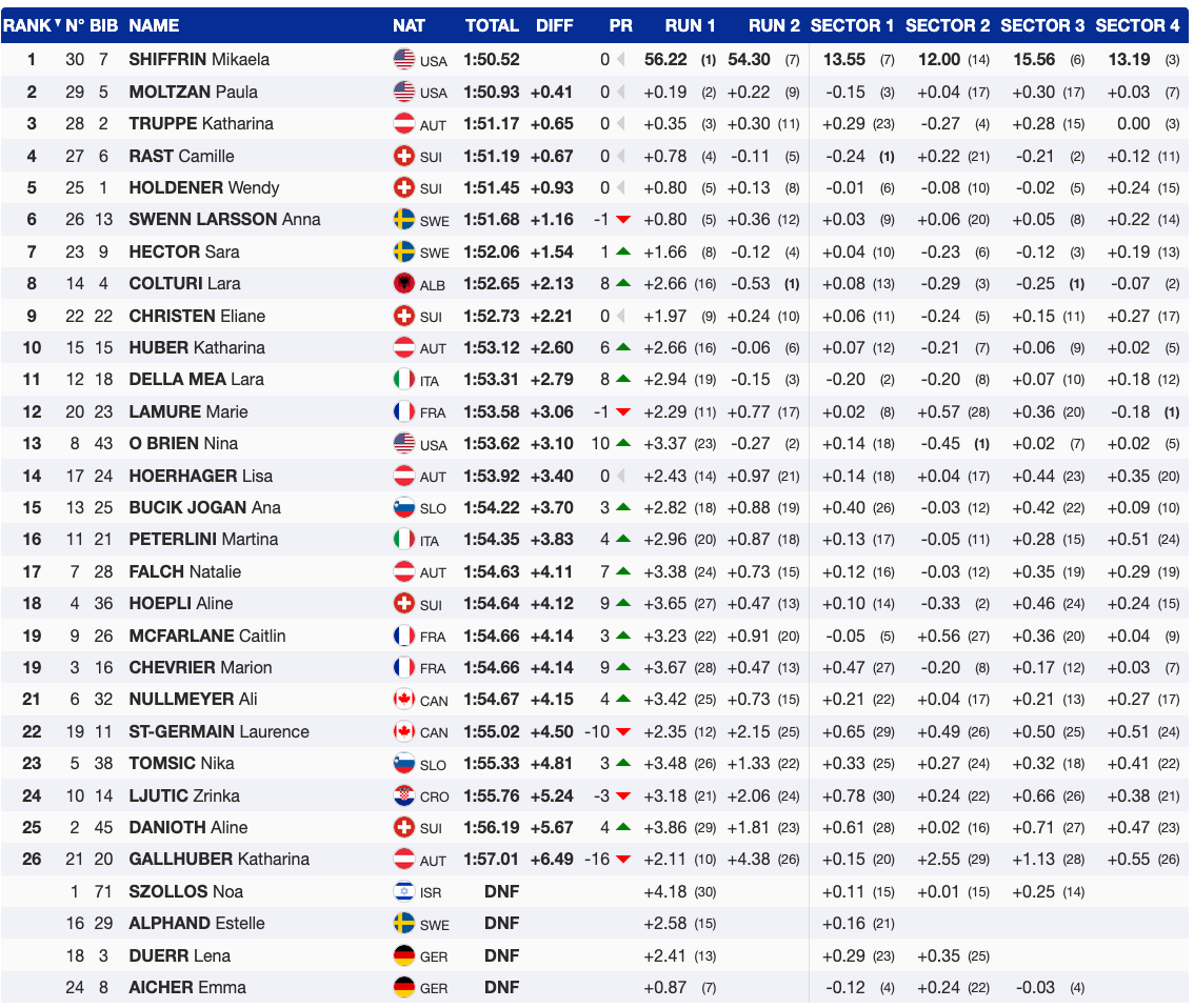 Fuori dal podio per soli 2 centesimi c'è Camille Rast, qundi Holdener, Swenn Larsson, Hector, Colturi, Cristen e Huber che chiude la top 10. Subito dopo ecco la prima azzurra, Lara Della Mea capace di recuperare ben 8 posizioni nella seconda manche. 11 esimo posto e un ennesimo buon piazzamento in stagione. Buon recupero anche per Martina Peterlini che scala quattro posizioni  e chiude 16 esima. Nessun'altra italiana era riuscita a qualificarsi per la discesa decisiva.