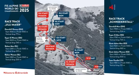 Saalbach (Austria) ospita dal 4 al 16 febbraio 2025 i 48 esimi Campionati del Mondo di sci alpino. E’ la seconda volta, dopo l’edizione del 1991, che la località sciistica del Salisburghese ospita la competizione iridata con 5 gare maschili, altrettante femminili e una a squadre che si disputeranno sulle piste Scheekristall e Ulli Maier. Alle quattro classiche specialità (slalom, gigante, superG e discesa), si aggiunge il parallelo a squadre misto e la nuova combinata a squadre che prevede una gara di discesa e uno slalom. Nell’ultima edizione dei Mondiali che si tenne in Francia, a Courchevel e Meribel nel 2023, la spedizione azzurra vinse due ori (Marta Bassino in superG e Federica Brignone in combinata), un argento (Federica Brignone in gigante) e un bronzo (Alex Vinatzer in slalom).