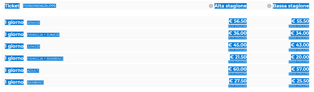 Prezzo skipass giornaliero intero: 60,00