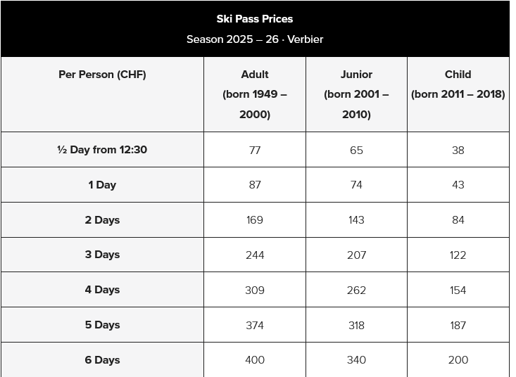 LISTINO PREZZI SKIPASS 2025 - 2026 VERBIER - LES 4 VALLES in Franchi Svizzeri
