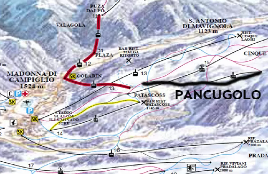 La seggiovia Pancugolo si raggiunge da Campiglio con la telecabina Cinque Laghi. Da qui scendi mantenendo la sinistra ed arriverai alla partenza della seggiovia Patascoss.