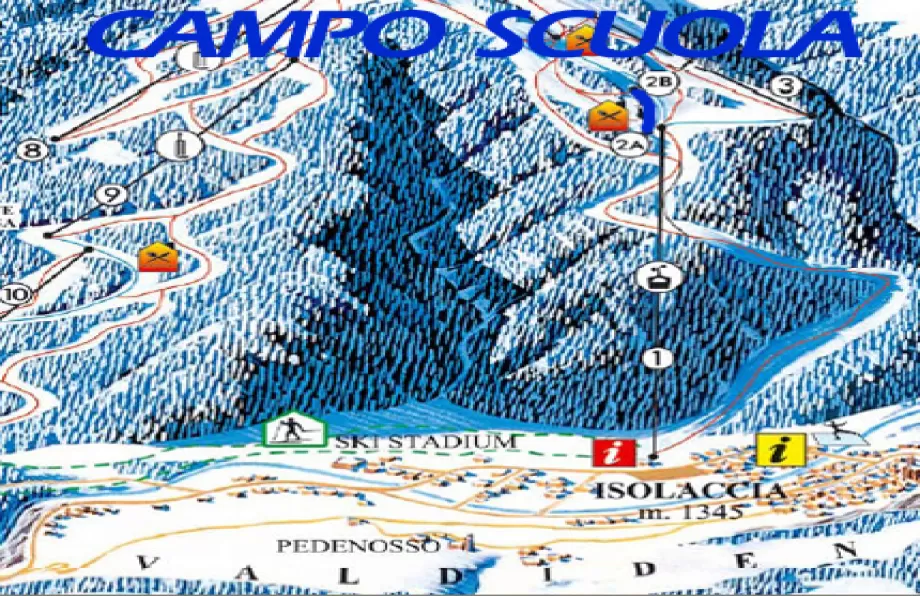 Da Isolaccia prendi la telecabina sino al Pian della Mota (1339 m - 1990 m). All'arrivo dell'impianto vi è un rifugio e il tapis roulant che porta sino in cima al Campo Scuola.