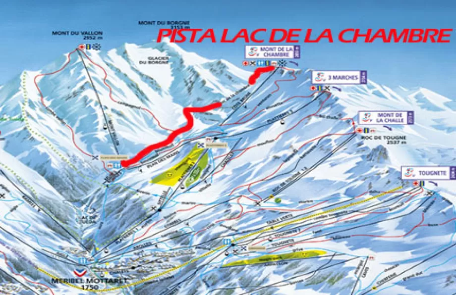 Dal Mont de La Chambre verso Meribel (Francia) scende una rossa che si insinua tra i pendii scoscesi del Mont du Borgne e del Mont Vallon. Una pista che offre ai nostri occhi splendidi scenari e ai nostri sci muri mozziafiato. E' la Lac de la Chambre. La prima parte della pista, subito dopo il tratto iniziale di riscaldamento, consta di un lungo tratto ripido con un susseguirsi di curve a S che aggirano le rocce del Mont de la Chambre e scendono sino al fondo della valle. Qui le pendenze sono un po' più dolci ma di tanto in tanto ecco qualche muro più impegnativo.