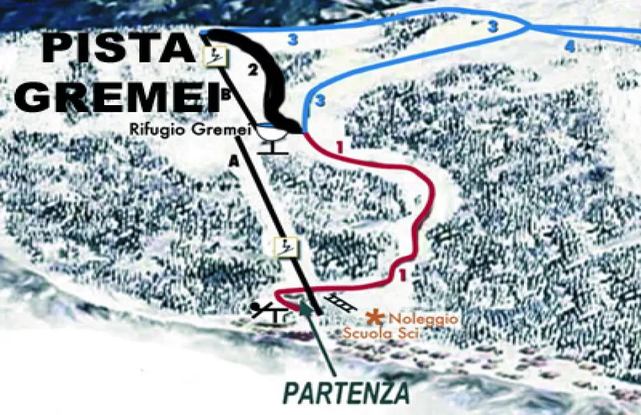 Dal fondovalle occorre prendere le due seggiovie quadriposto Gremei 1 e 2. La pista Gremei inizia subito alla destra della seggiovia Gremei 2 seguendone la linea. La Del Bosco inizia di fianco al rifugio, all'arrivo della seggiovia Gremei 1.