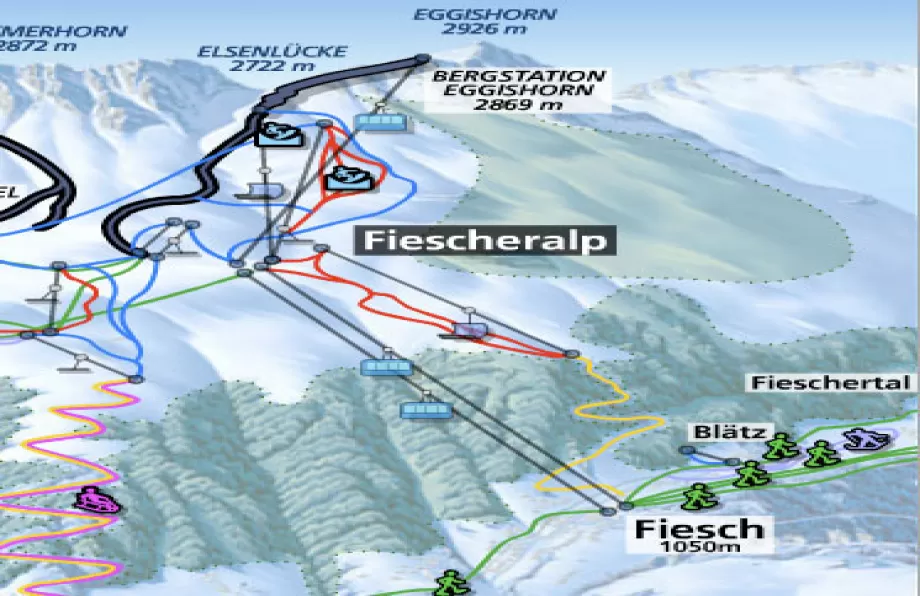 La pista è servita dalla funivia dell'Eggishorn; usciti dalla stazione di arrivo vi trovererte davanti l'imponente scenario dei 4000 del Vallese e il suggestivo ghiacciaio dell'Aletsch, una lingua di ghiaccio lunga 23 kilometri per 86 kilometri quadrati di estensione.