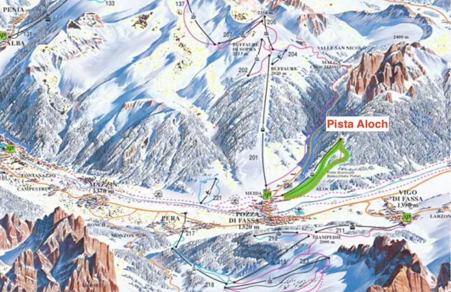La pista Aloch (detta anche Ski Stadium Aloch) si trova nella skiarea Pozza - Buffaure, salndo verso Meida. E' stata realizzata nel 1998 ed è stata allargata ed allungata nel 2018 per poter accogliere ambedue le discipline tecniche dello sci: quindi oltre allo slalom speciale anche lo slalom gigante per i Campionati Mondiali Junior di Sci alpino dal febbraio 2019. Le competizioni tecniche (slalom speciale, slalom gigante, team event e combinata alpina) si possono svolgere quindi sulla nuova pista da sci da discesa 'Aloch Gigante'.