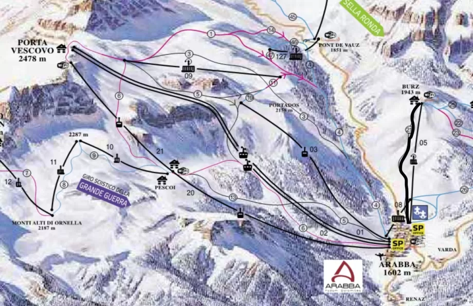 La pista è servita dalla seggiovia Burz che sale da Arabba sul versante opposto rispetto a Porta Vescovo